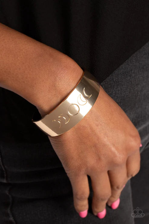 The phases of the moon are engraved across the front of a thick, shiny, gold cuff, creating an effortlessly celestial statement piece.