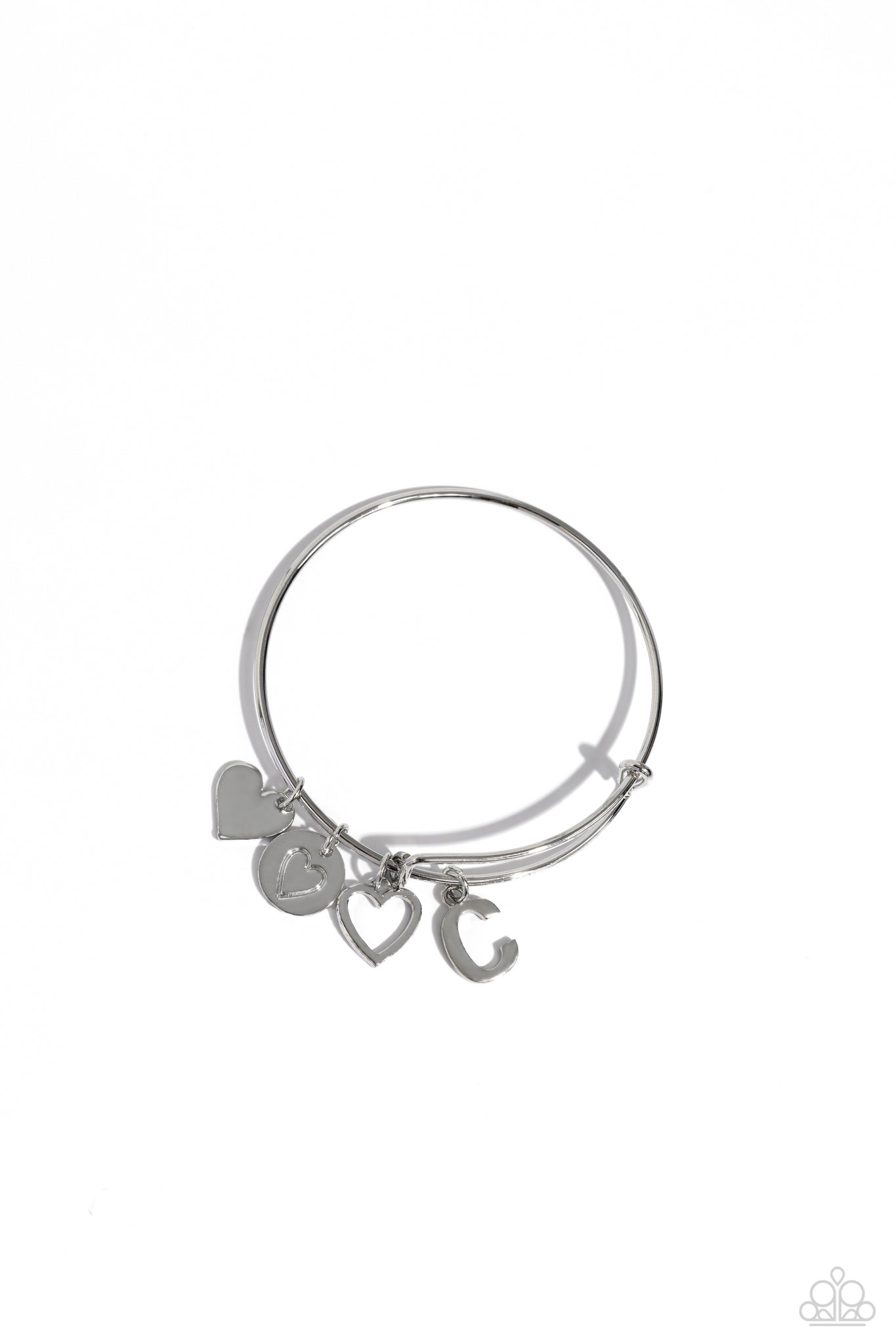 Featuring shiny silver, airy, and stamped finishes, a mismatched collection of dainty heart charms, and the letter "C" glides along a silver bar fitting at the center of the wrist for a romantic, sentimental flair.