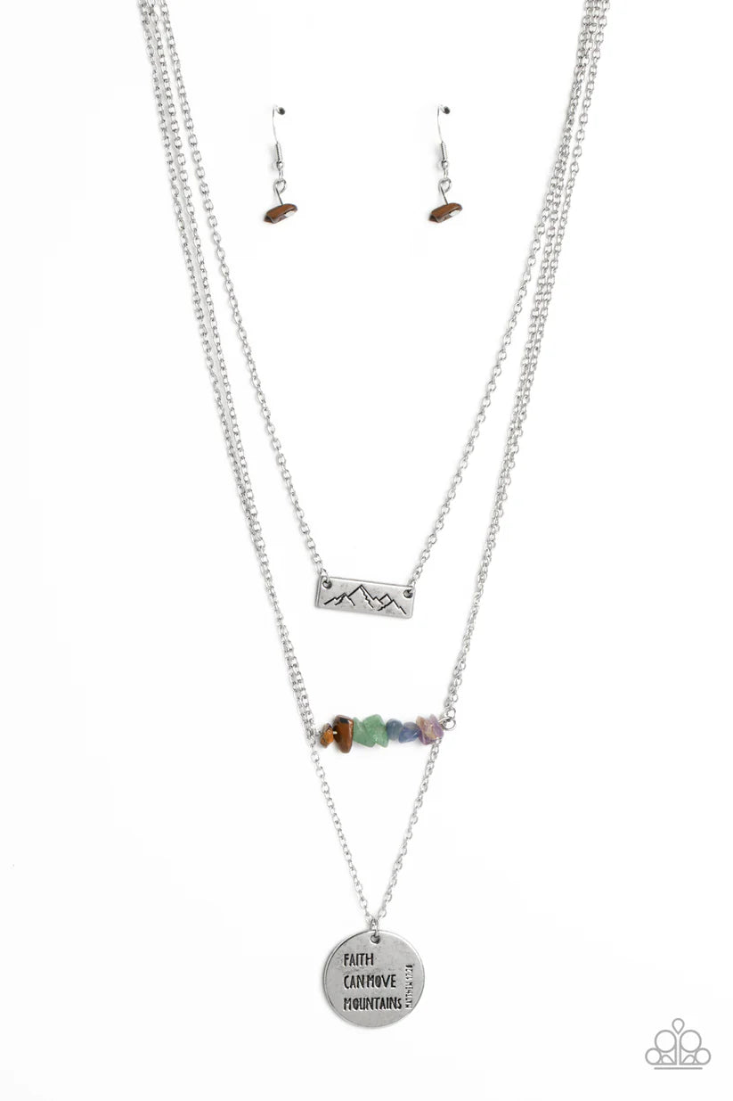 Infused with three earthy pendants, three shimmery silver chains layer across the chest. A silver rectangular plate, stamped with a mountain outline swings from the uppermost chain above a row of chiseled tiger's eye, jade, lapis, and amethyst stones. An oversized shimmery silver disc stamped with the phrase Faith can move mountains" with the scripture reference "Matthew 17:20" listed to the side of the disc hangs from the lowermost chain for a wanderlust vibe. As the stone elements in this piece are natural, some color variation is normal.
