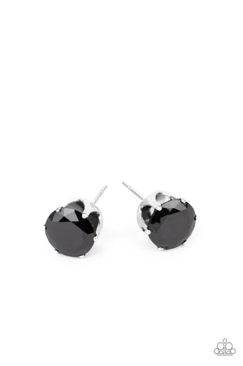 An oversized black rhinestone is nestled inside a pronged silver fitting, creating a timeless statement piece. Earring attaches to a standard post fitting.