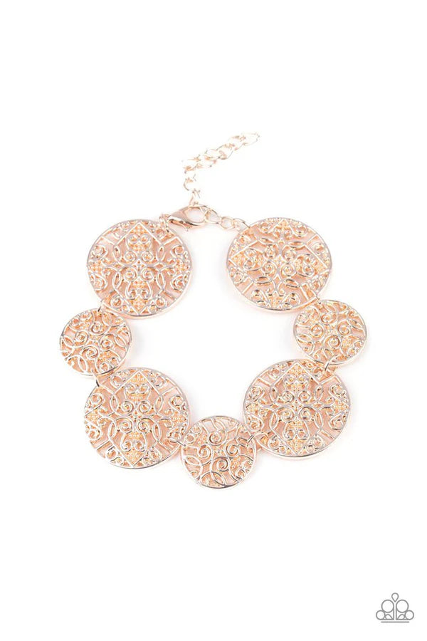 Filled with shiny mandala-like filigree, a collection of glistening rose gold discs link around the wrist for a whimsical fashion. Features an adjustable clasp closure.
