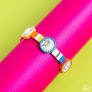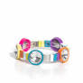Strung along elastic stretchy bands, a bodacious collection of silver accents, and varying metallic accents dipped in multicolored shades encircle the wrist. Sporadically infused between the colorful display, concaved circular frames in orange, yellow, purple, Pink Peacock, and blue shades feature faceted white gems that come to a point for a touch of sparkle.