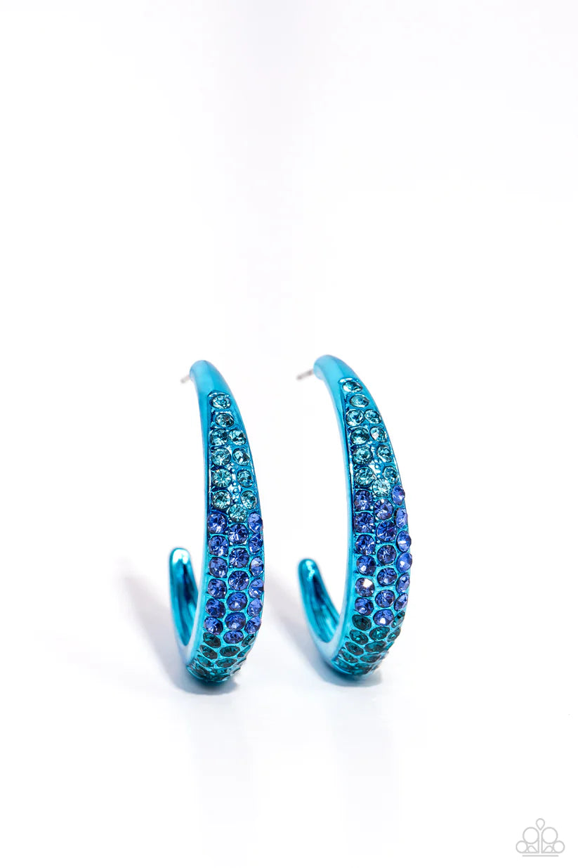 Featuring an ombré effect, classic aquamarine, light sapphire, and blue zircon rhinestones fade into one another as they dot the outer curve of a beveled, electric blue hoop, resulting in a jaw-dropping dazzle. Earring attaches to a standard post fitting. Hoop measures approximately 1 1/4" in diameter.
