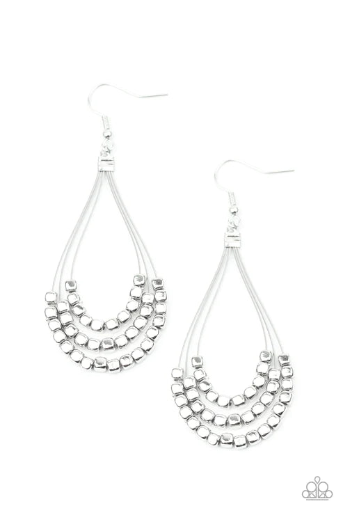 Three rows of dainty silver cube beads glides along shiny silver wire, layering into an edgy teardrop lure. Earring attaches to a standard fishhook fitting.