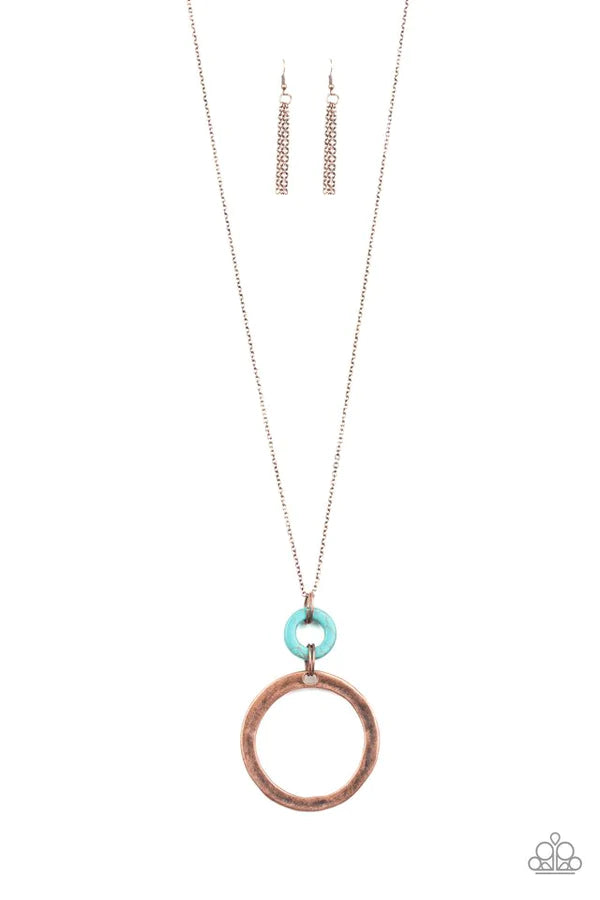 Featuring a delicately hammered finish, an oversized copper hoop links with a refreshing turquoise stone ring at the bottom of a lengthened copper chain for a sophisticated look. Features an adjustable clasp closure.