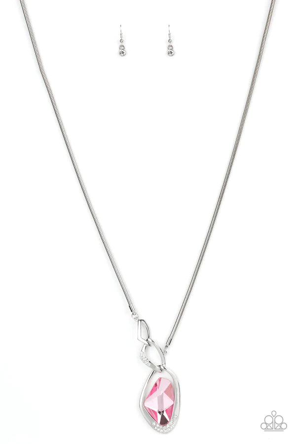 A faceted pink gem is nestled inside of a shimmery silver frame encrusted in dainty white rhinestones. The glittery pendant asymmetrically links with abstract silver frames at the bottom of a lengthened silver rounded snake chain for a modern look. Features an adjustable clasp closure.