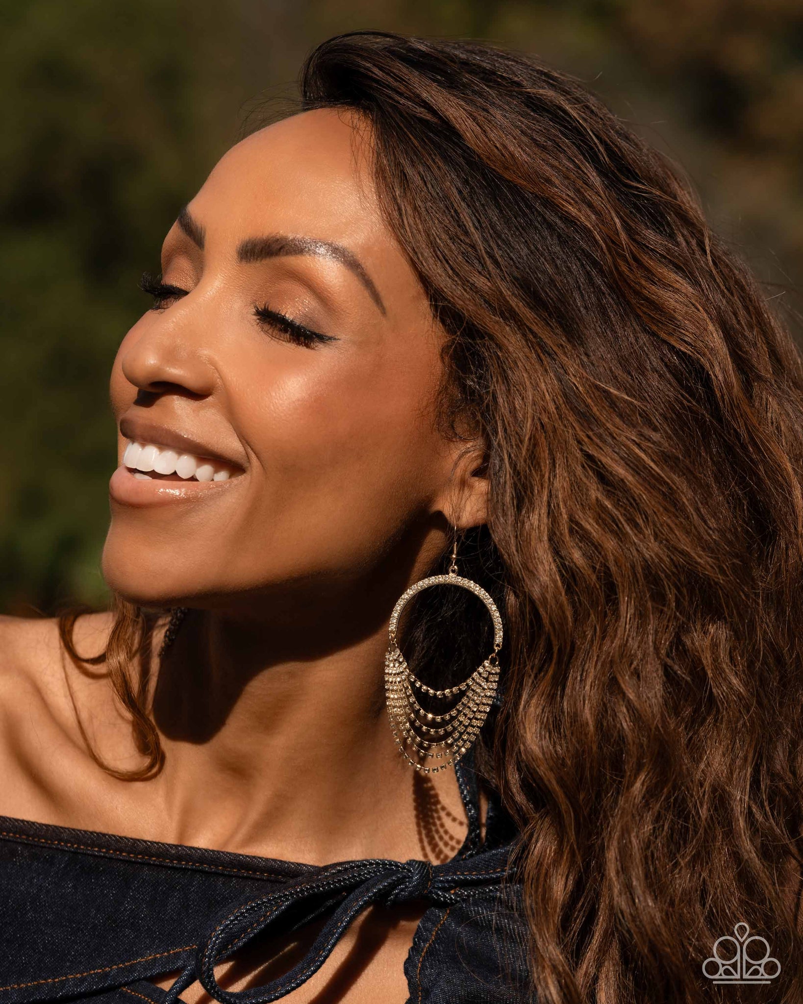 Dusted in glistening white rhinestones, an arched gold bar gives way to a sextet of sparkly white rhinestone strands in gold-square fittings that taper and layer below the ear for a glamorously glittery look. Earring attaches to a standard fishhook fitting.