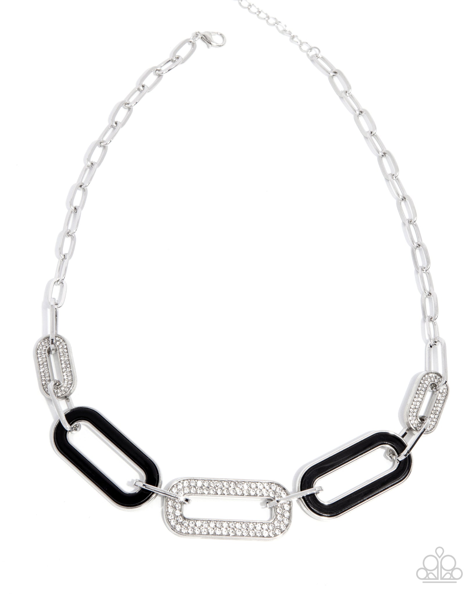 Attached to a classic silver paperclip chain, elongated paperclip chain links including black-painted acrylics and white crystal-like rhinestone embellished links alternate below the neckline for an attention-grabbing pop of color and shimmer. Features an adjustable clasp closure.