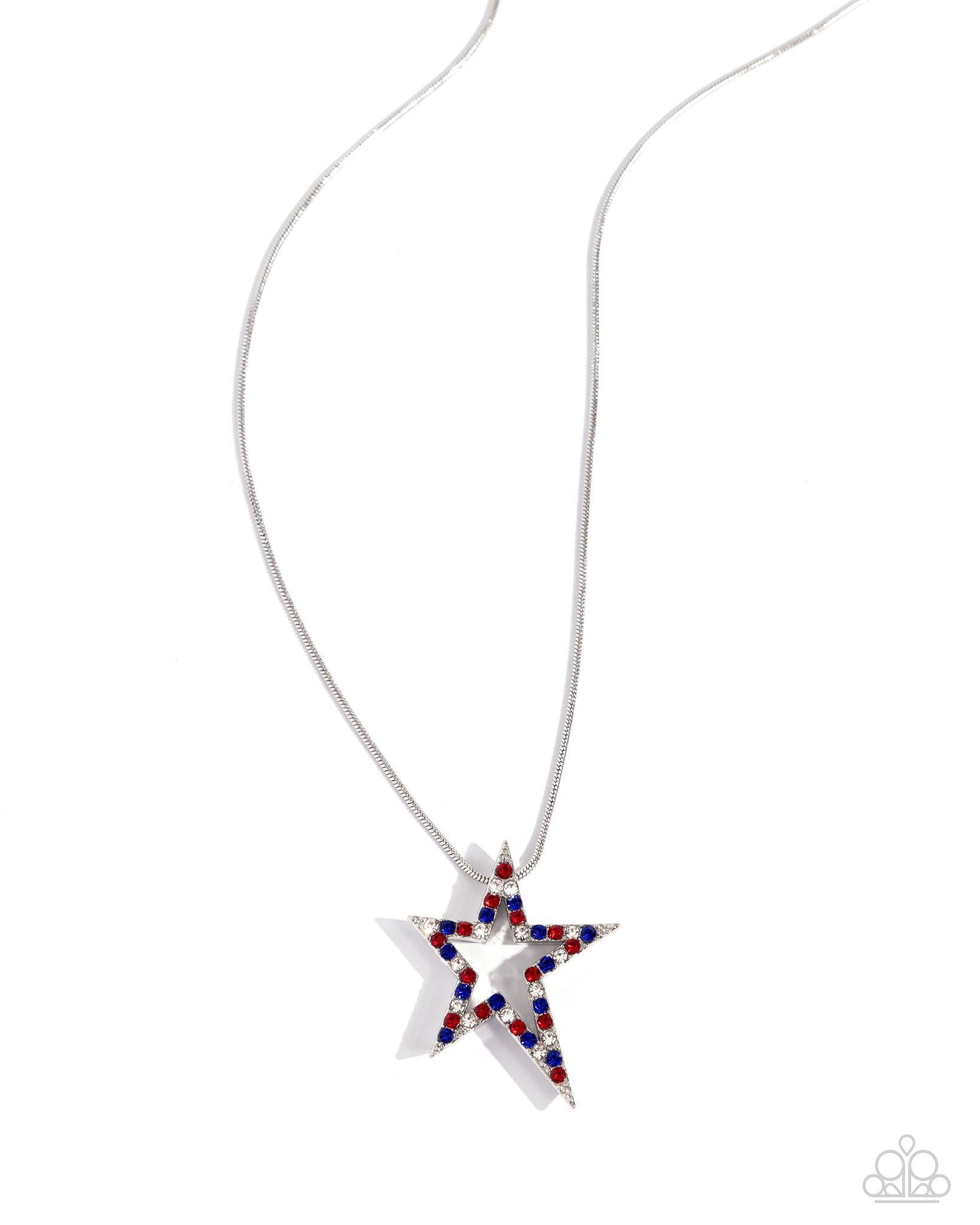 Embellished in red, white, and blue rhinestones, an airy asymmetrical silver star glides along a silver snake chain for a pretty, patriotic statement. Features an adjustable clasp closure.