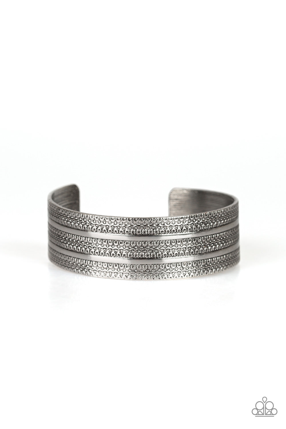 Brushed in an antiqued shimmer, flat silver ribbons race across a silver cuff embossed in tactile textures for a tribal inspired flair.