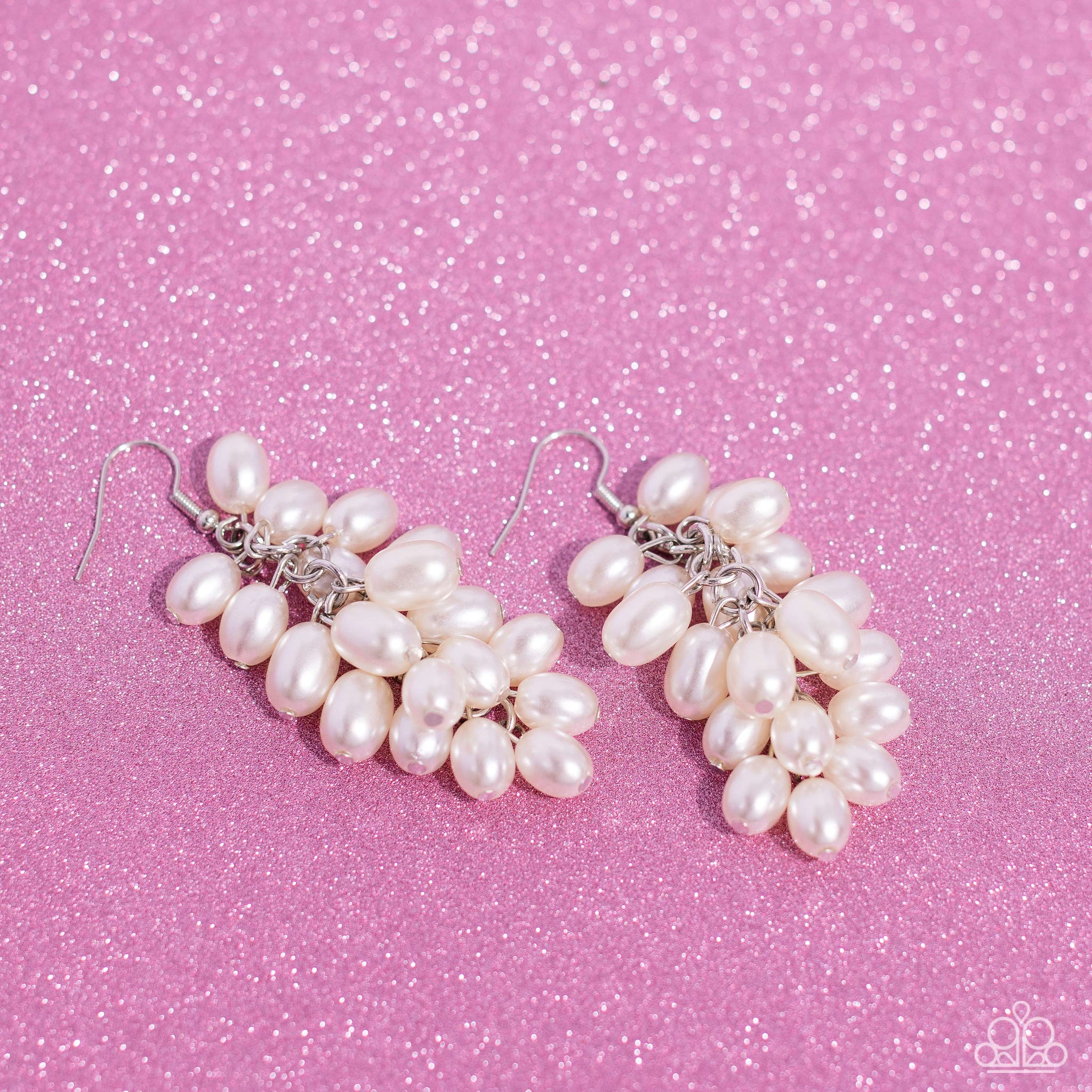 A bubbly collection of oval white pearls trickles from a single silver chain, resulting in a boisterous tassel. Earring attaches to a standard fishhook fitting.