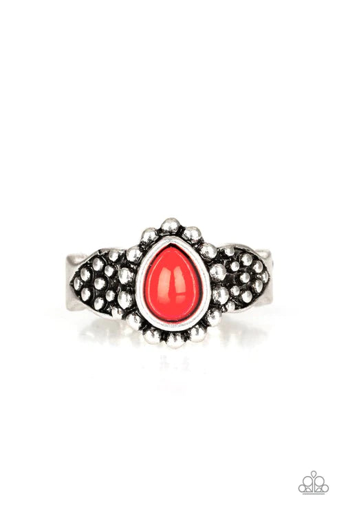 A teardrop red bead is pressed into the center of a dainty silver band radiating with studded patterns for a seasonal look. Features a dainty stretchy band for a flexible fit. Sold as one individual ring.