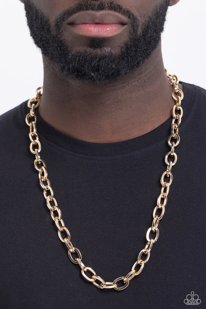 A dramatically oversized collection of oval gold links boldly interlocks across the chest, resulting in an intense industrial centerpiece. Features an adjustable clasp closure.