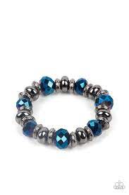 An oversized assortment of textured gunmetal rings, smooth gunmetal beads, and metallic blue crystal-like beads are threaded along stretchy bands around the wrist for a glitzy finish.