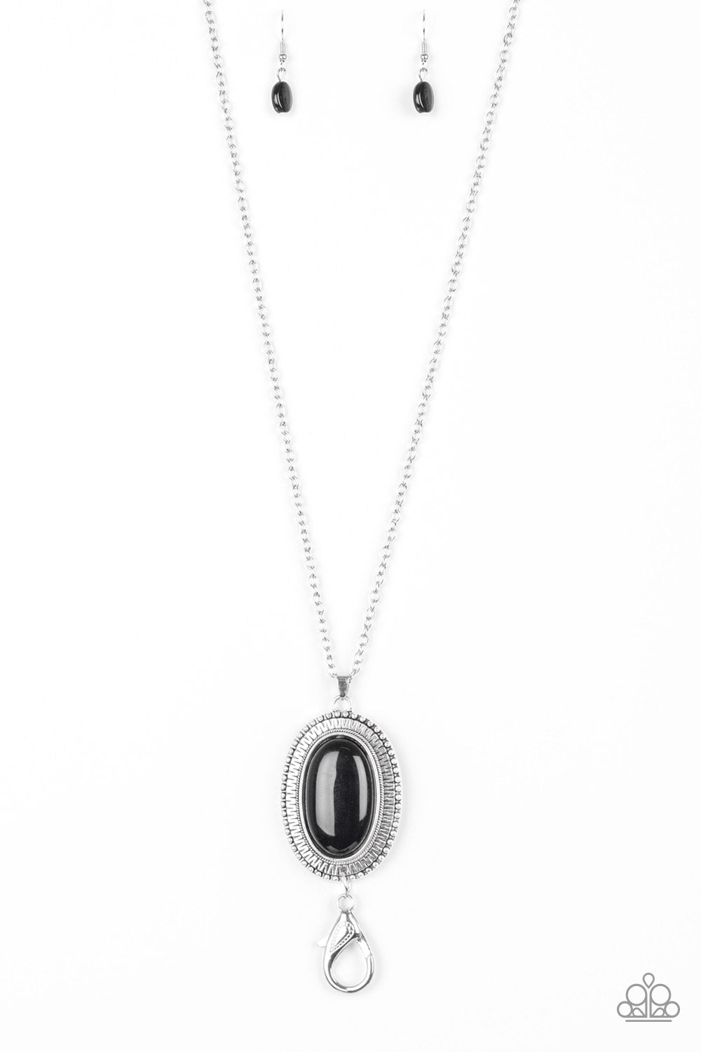 Brushed in a faux rock polish, a shiny black bead is pressed into an ornate silver frame for a seasonal look. A lobster clasp hangs from the bottom of the design to allow a name badge or other item to be attached. Features an adjustable clasp closure.