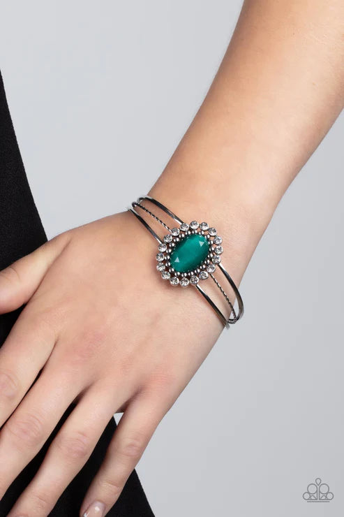 Bordered in glitzy rings of glittery white rhinestones and shiny silver studs, a faceted Leprechaun gem adorns the center of an ornately layered silver cuff for a flowery fashion.