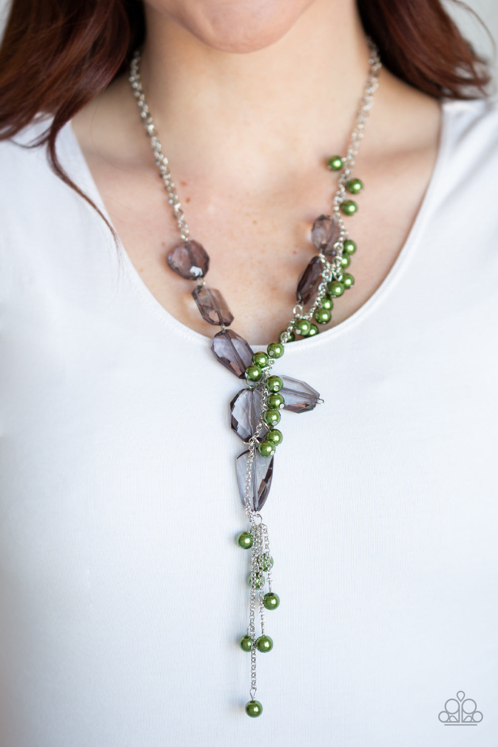 Featuring an array of shapes and cuts, a collection of faceted smoky gems link below the collar for a glamorous shimmer. A shimmery silver strand of pearly green beads trickles down one side of the piece, creating a flirtatious extended pendant. Features an adjustable clasp closure.