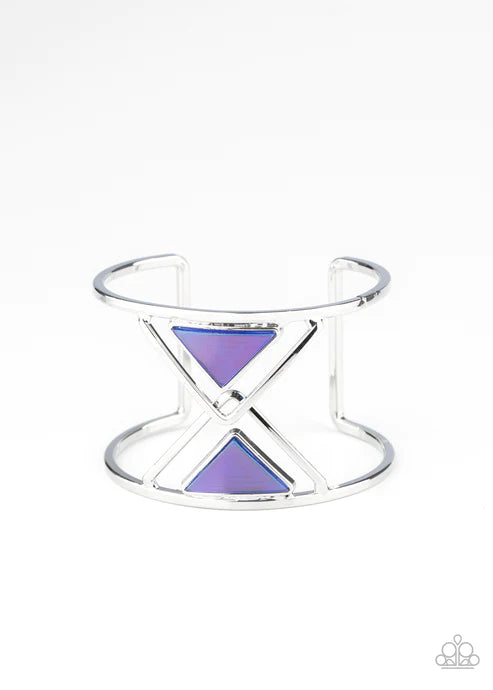 Featuring an iridescent finish, a pair of blue acrylic triangles dot the centers of two overlapping silver triangle frames inside an airy silver cuff for an edgy fashion.