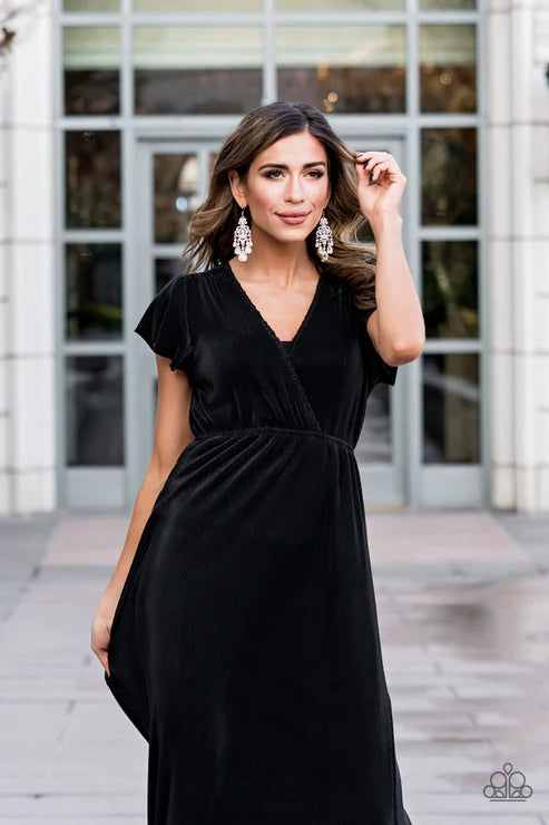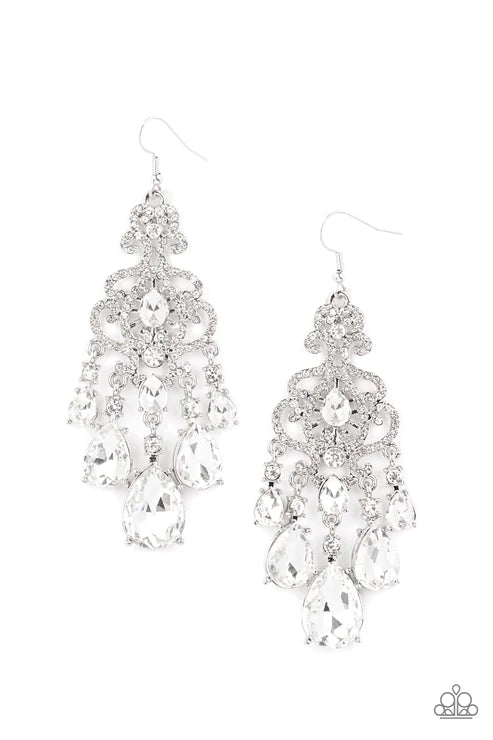 Gradually increasing in size, glassy white teardrop gems creating a dramatic fringe at the bottom of a decorative silver frame swirling with dainty white rhinestones for a timelessly over-the-top sparkle. Earring attaches to a standard fishhook fitting.