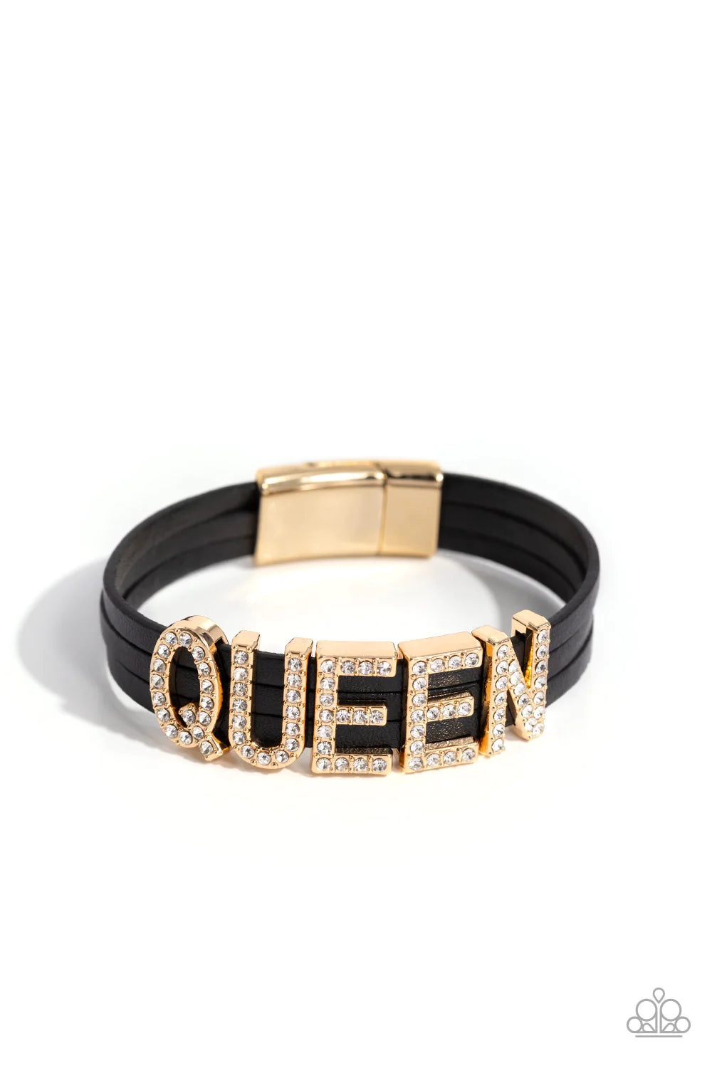 Featuring glistening white rhinestones, gold letter frames forming the word "QUEEN" are threaded along layers of black leather strands around the wrist for a dazzling statement. Features a magnetic closure.