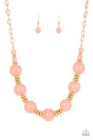 An oversized collection of glassy Pale Rosette beads and shiny gold discs are threaded along an invisible wire, creating a dramatic pop of color below the collar. Features an adjustable clasp closure.