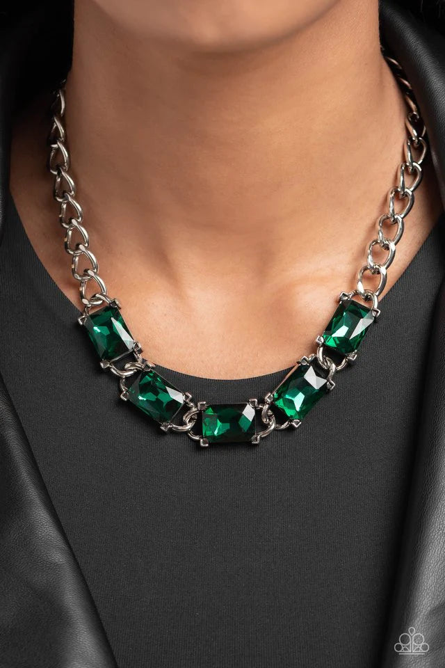 A succession of gleaming, radiant-cut, emerald green gems encased in thick silver frames, coalesces around the neckline on a thick silver curb chain for an edgy statement. Features an adjustable clasp closure.