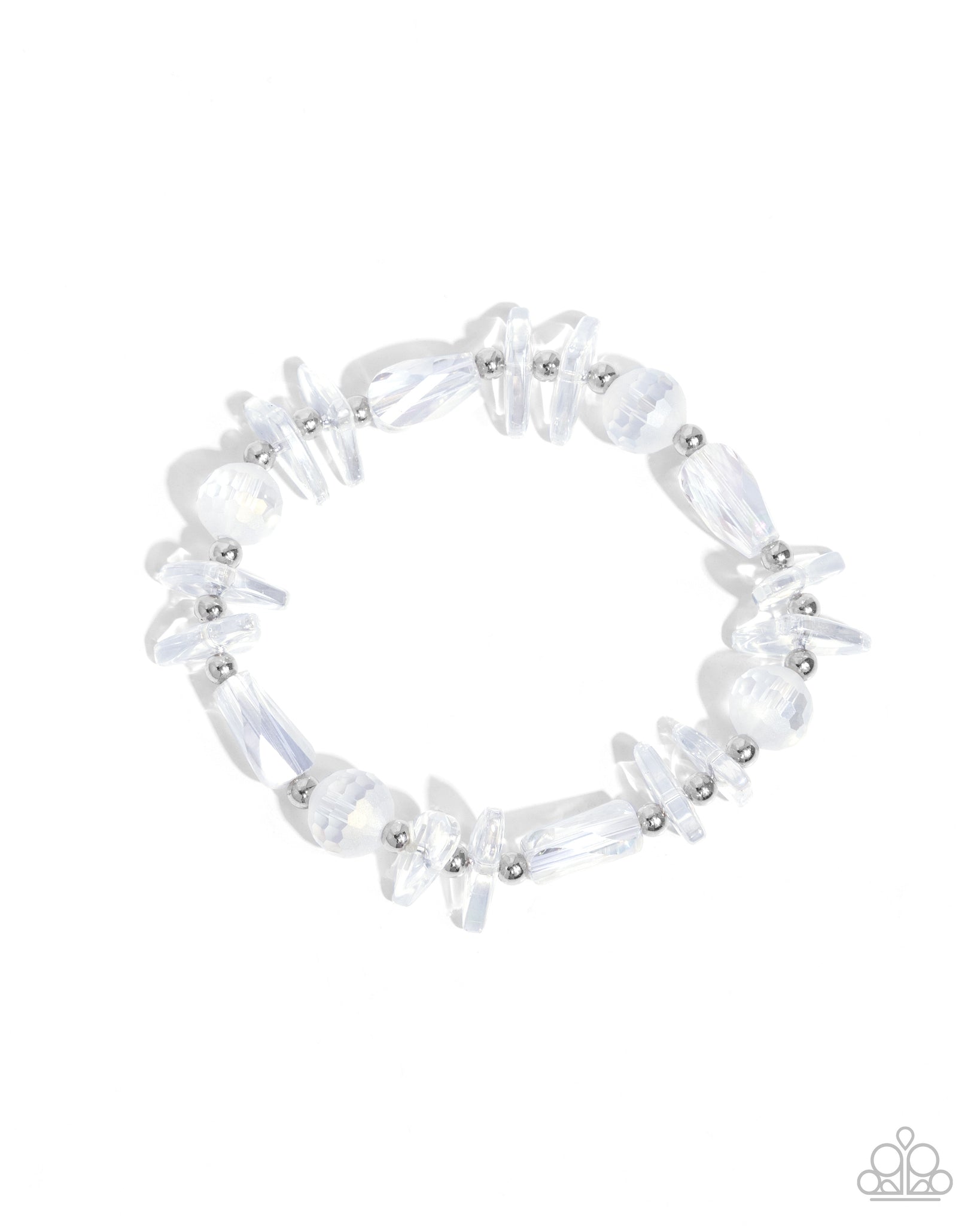 Infused along an elastic stretchy band, a collection of silver beads alternate with clear faceted beads, clear transparent discs, and iridescent-splashed abstract beads cascade along the wrist for a remarkably, reflective look. Due to its prismatic palette, color may vary.