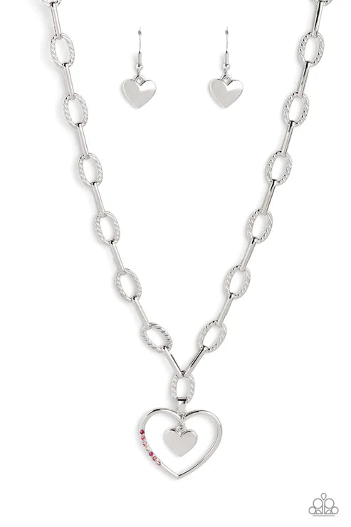 Textured ovals and elongated silver links lead the eye down to an oversized, airy, silver heart frame. Encrusted along one of the curves of the silver heart, dainty rhinestones in shades of pink, including fuchsia, rose, light rose, and iridescence, glimmer for a subtle pop of color. Dangling inside the oversized heart frame, a silver heart pendant swings for a romantic finish. Features an adjustable clasp closure. Due to its prismatic palette, color may vary.