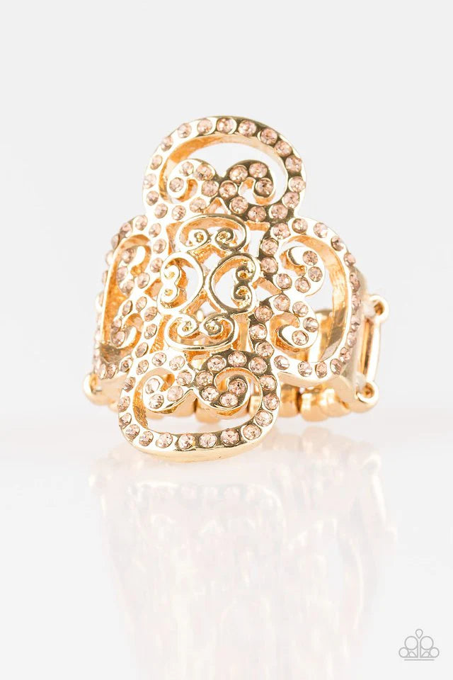 Dainty peach rhinestones are encrusted along a glistening gold frame radiating with regal filigree for a refined look. Features a stretchy band for a flexible fit. Sold as one individual ring.