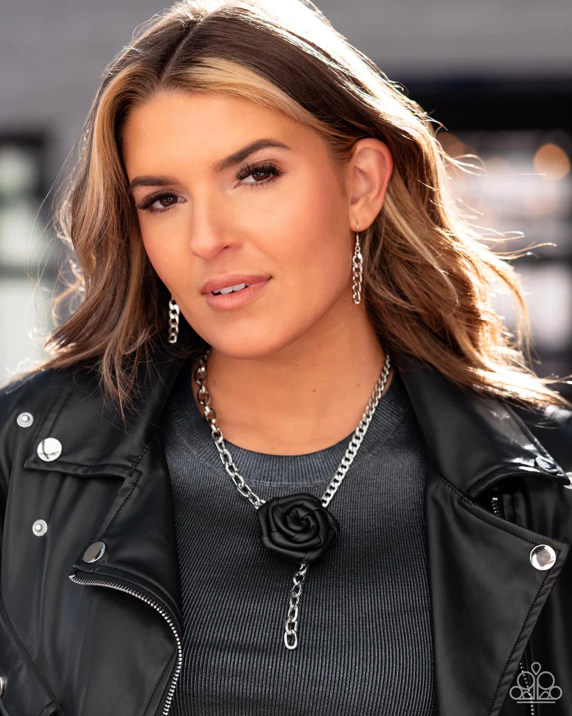 A silver cable chain collides with a silver curb chain to create a monochromatic blend of grit. A black leather rosette hangs below the contrasting chains, adding a whimsically edgy touch. The black leather rosette gives way to a solitaire silver chain strand for additional edgy detail. Features an adjustable clasp closure.