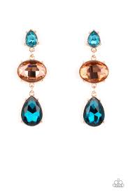 A small, light blue, teardrop-shaped gem gives way to a peachy oval-shaped rhinestone tilted on its side. A large, deep blue teardrop swings from the oval above, adding dramatic movement to the colorful display. Each faceted gem is set in pronged rose gold fittings, exaggerating their sparkle as they swing from the ear in a lustrous finish.