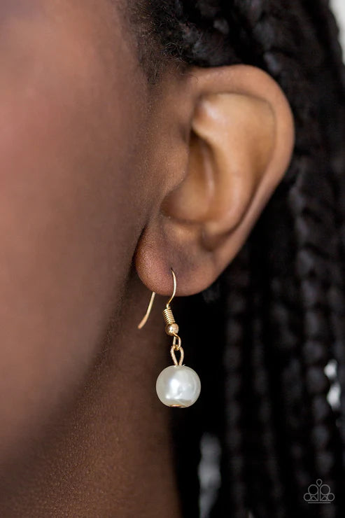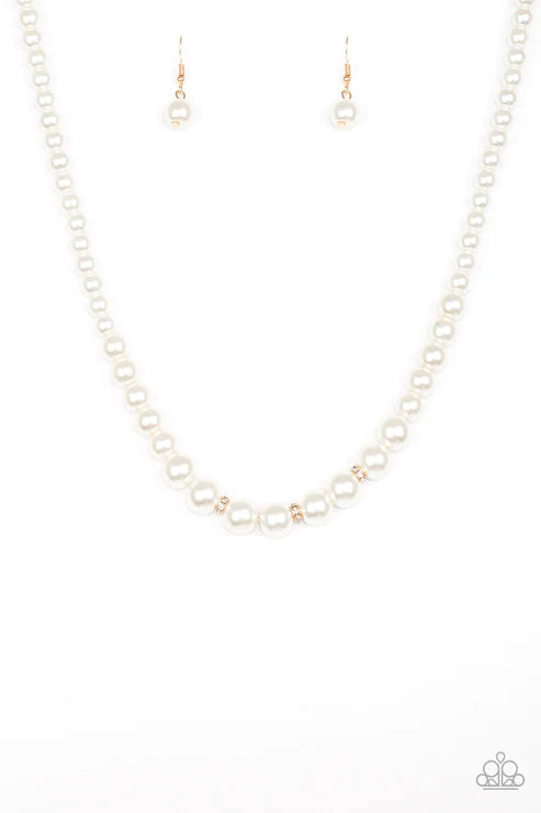 Gradually increasing in size near the center, a strand of luminescent white pearls falls just below the collar. White rhinestone encrusted rings are sprinkled along the center for a timeless finish. Features an adjustable clasp closure.
