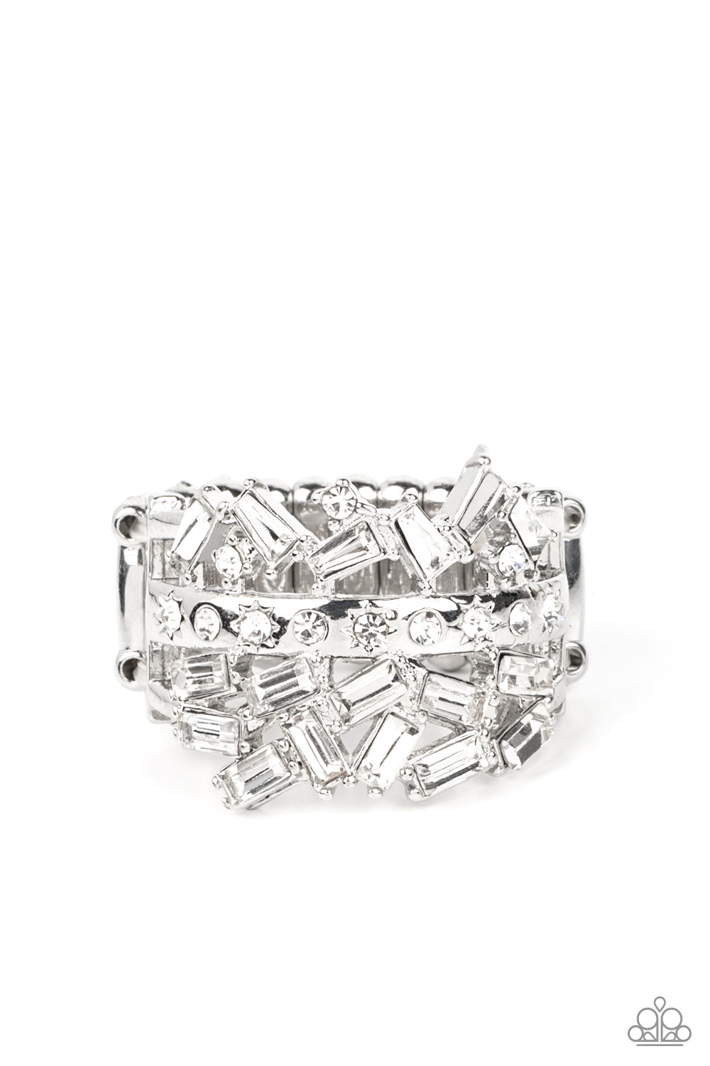 Dotted in dainty white rhinestones, a single silver band separates a haphazard explosion of round and emerald cut rhinestones across the finger. Features a stretchy band for a flexible fit.