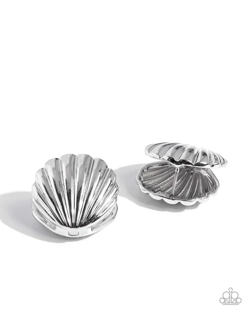 Featuring ribbed texture, high-sheen silver seashells open around the ear for a beachy basic. Earring attaches to a standard hinge closure fitting. Hoop measures approximately 1" in diameter.