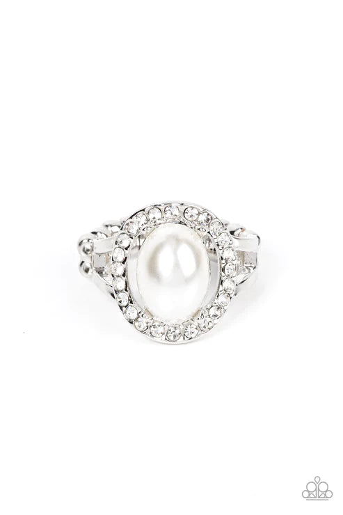 An oval white pearl seemingly floats inside a glittery ring of white rhinestones atop layered bands of silver, resulting in a timeless centerpiece atop the finger. Features a dainty stretchy band for a flexible fit.