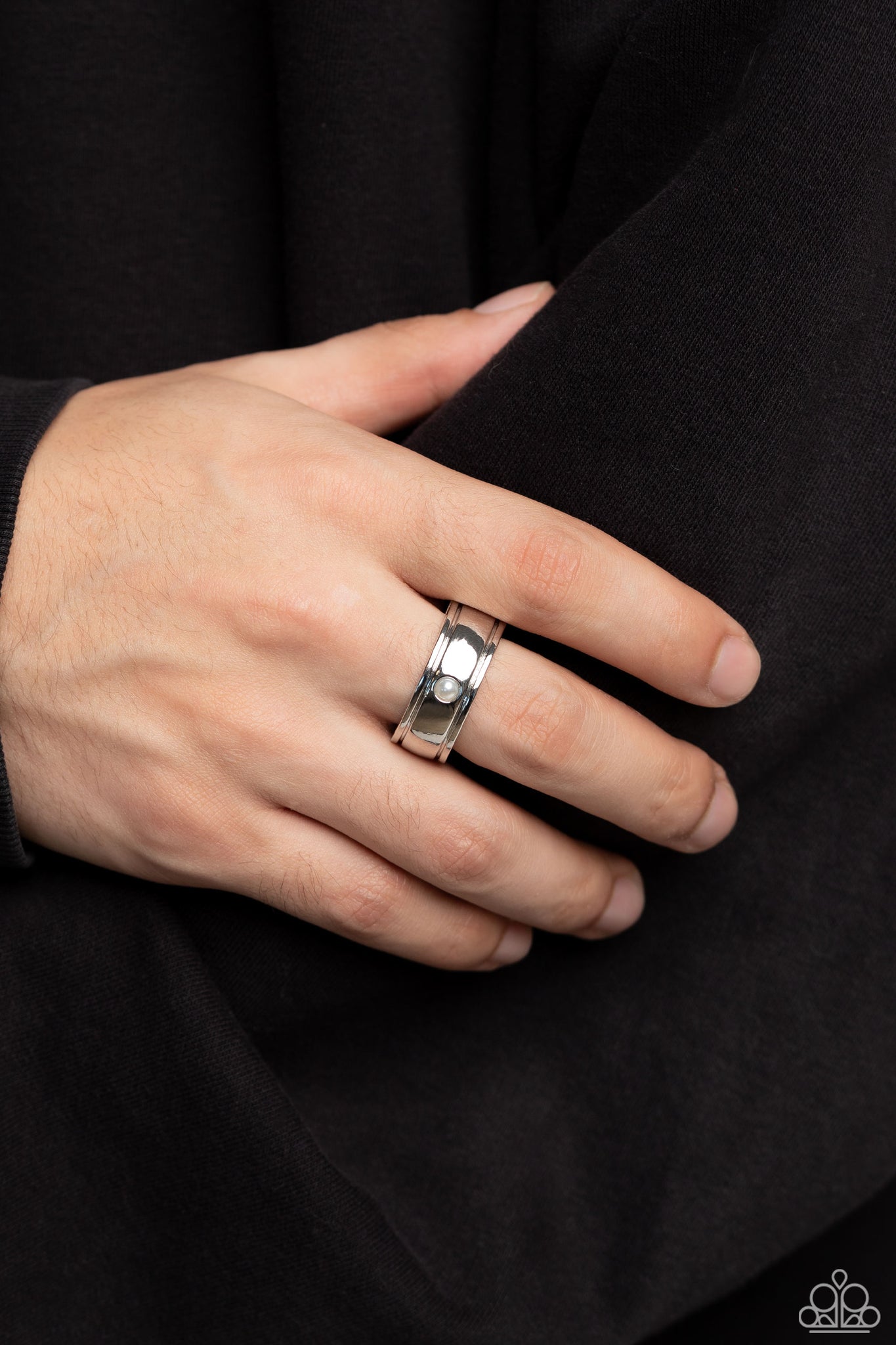 Dotted with a dainty white pearl center, a shiny, sleek silver band stands out against the finger for a sophisticated finish. Features a stretchy band for a flexible fit.