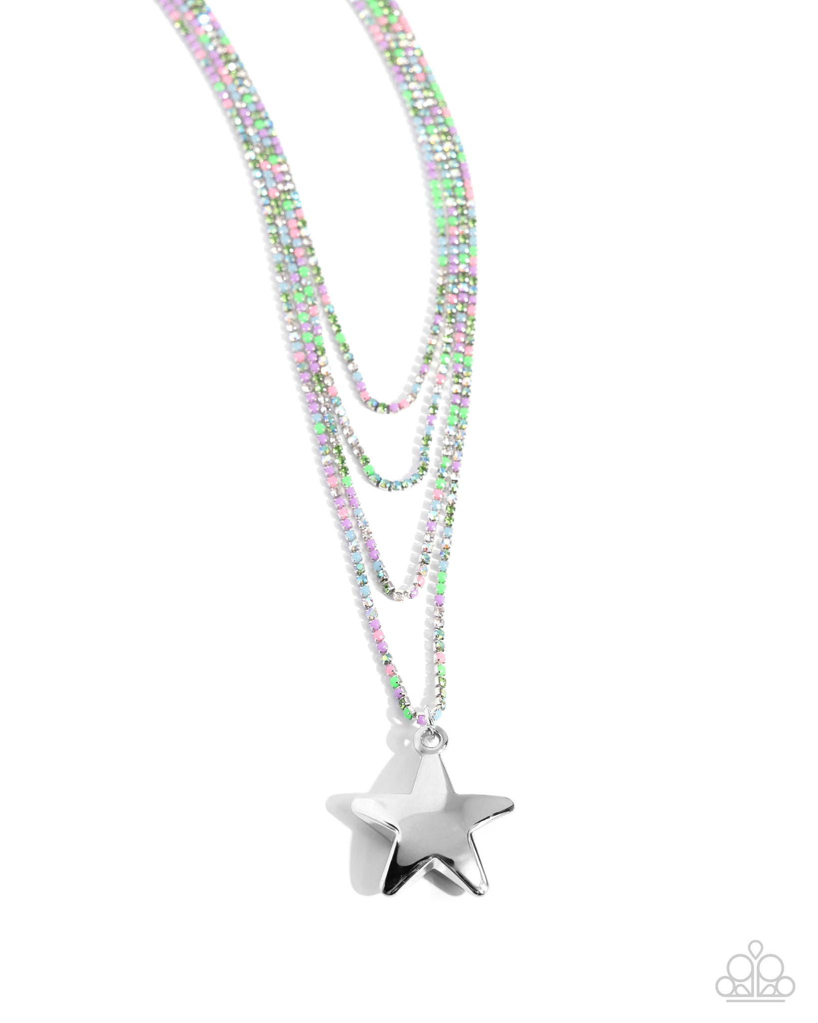 Set in silver square fittings, a collection of multicolored rhinestones and painted beads coalesce below the neckline in a multitude of layers for a pop of bright color. A silver star charm dances along the lowermost multicolored strand for a Sunset-inspired finish. Features an adjustable clasp closure.