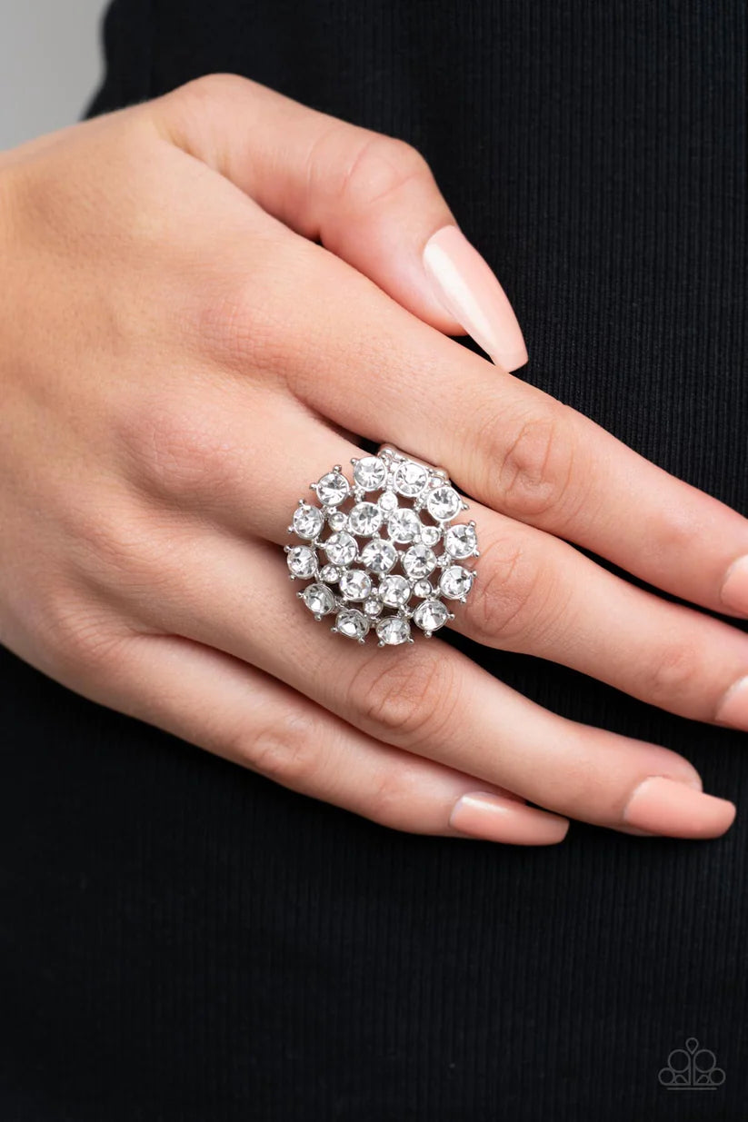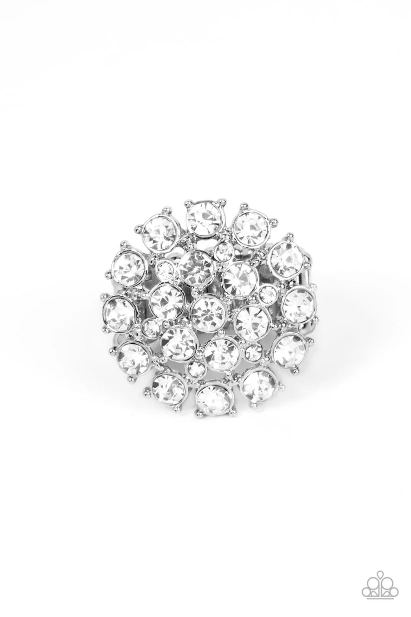 Featuring pronged silver fittings, an explosion of glassy white rhinestones sparkles atop the finger for a statement-making fashion. Features a stretchy band for a flexible fit.