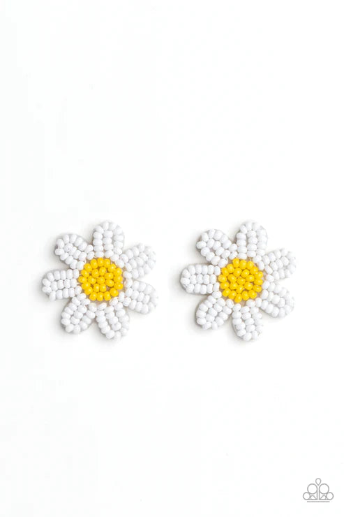 Layers of white seed bead petals fan out from a yellow seed bead center, blooming into a textured floral centerpiece. Earring attaches to a standard post fitting.