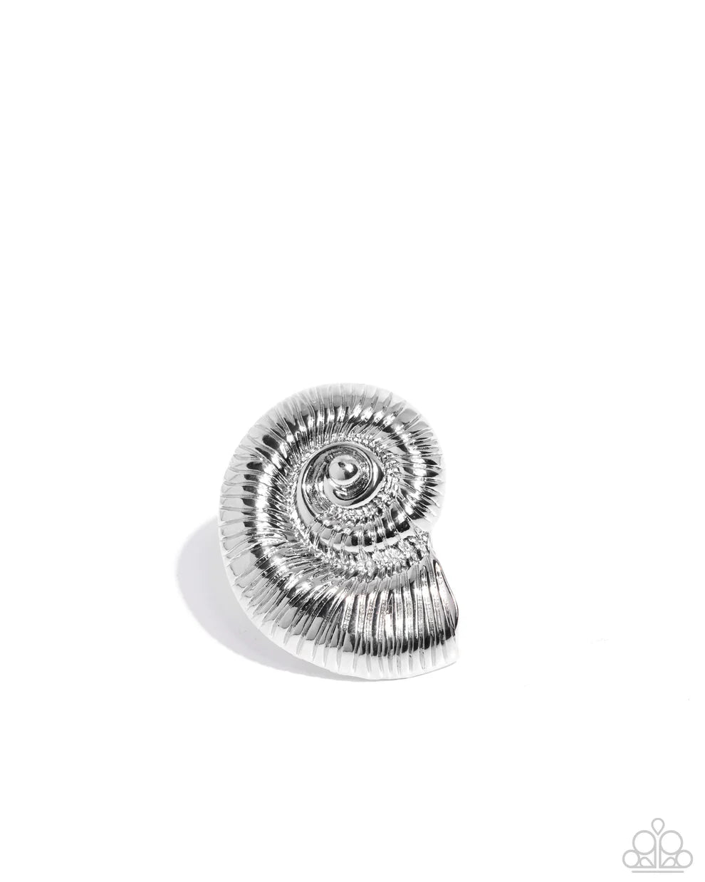 Featuring a high-sheen finish, a silver shell spirals atop the finger for a nautical effect. Features a stretchy band for a flexible fit.