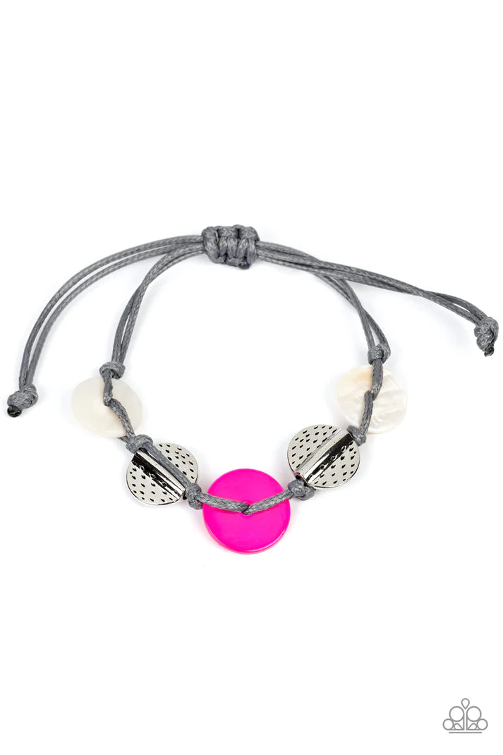 Vibrant pink and white shells interlace with silver dotted, hammered discs to create a refined pop of color. Held together by soft gray cording, this piece will blend in with beaches near you! Features an adjustable sliding knot closure.