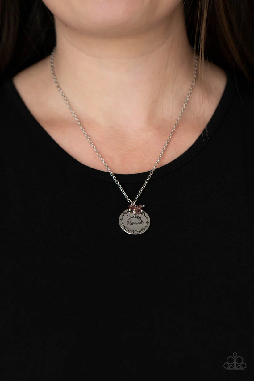 Bordered in a leafy pattern, a shiny silver disc is stamped with the phrase, "Simply Blessed," joins a dainty cluster of iridescent purple crystal-like beads at the bottom of a chain, creating an inspirational pendant below the collar. Features an adjustable clasp closure.