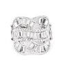Rich white rhinestones, chiseled into dramatic emerald-cuts, fall in line along twisting bands of silver. Tiny white rhinestones border the top and bottom edges of the swirling silver bands, emphasizing the shimmer as they interlock across the top of the finger. Features a stretchy band for a flexible fit.
