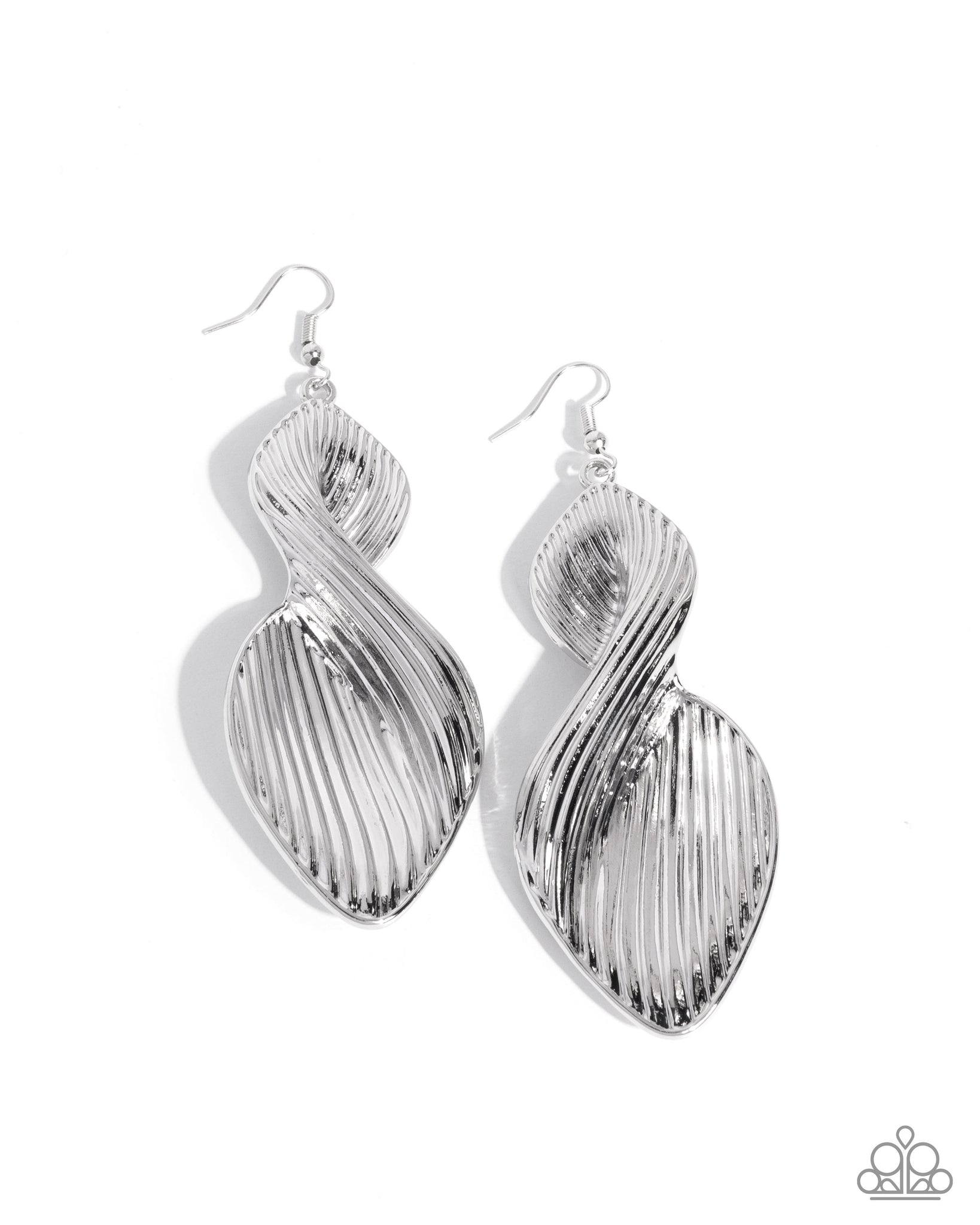 Rippled silver plates cascade into an elegant, asymmetrical silhouette. The textured surface catches and reflects light for a dynamic, fluid effect, perfect for adding a modern touch to any outfit. Earring attaches to a standard fishhook fitting.