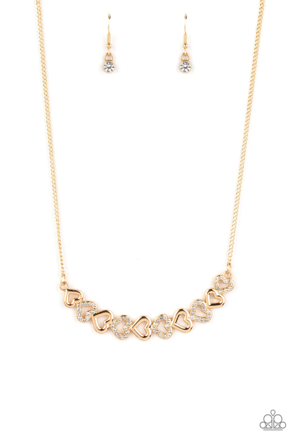 Gold, heart-shaped silhouettes are tilted on their sides, falling in line with variations of the same gold frames encrusted in white rhinestones. The alternating pattern of metallic sheen and glittery shimmer adds eye-catching detail, as the hearts connect into a curved pendant that sits just below the collar. Features an adjustable clasp closure.