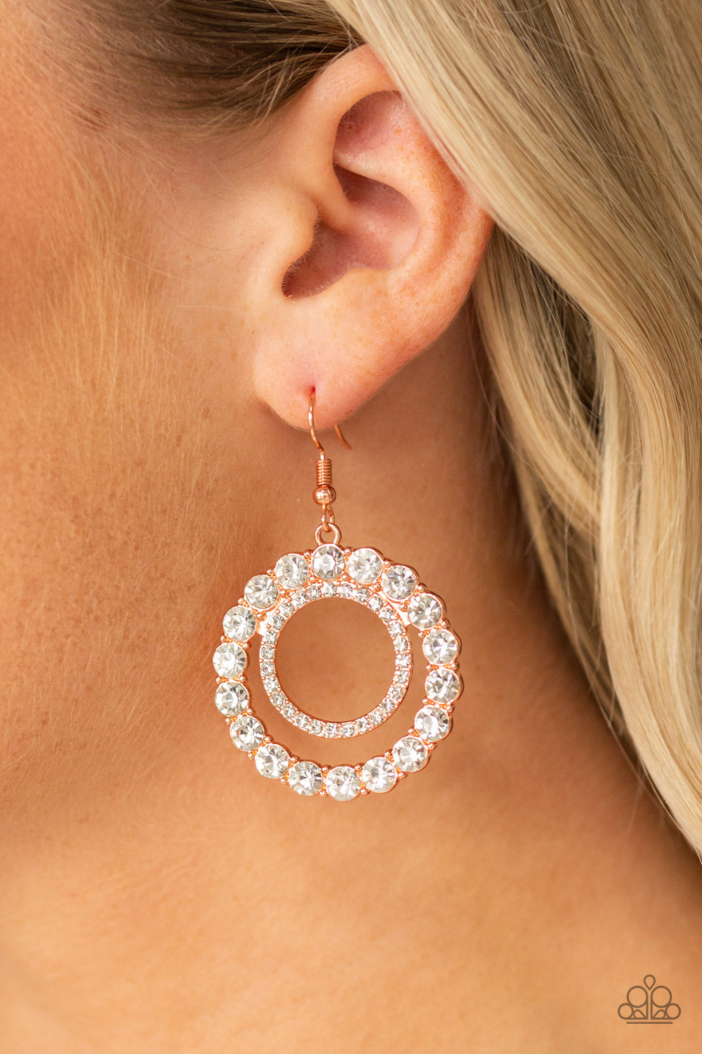Encrusted in glassy white rhinestones, a dainty shiny copper ring attaches to the top of a larger hoop radiating with blinding white rhinestones for a glamorous, statement-making look. Earring attaches to a standard fishhook fitting.