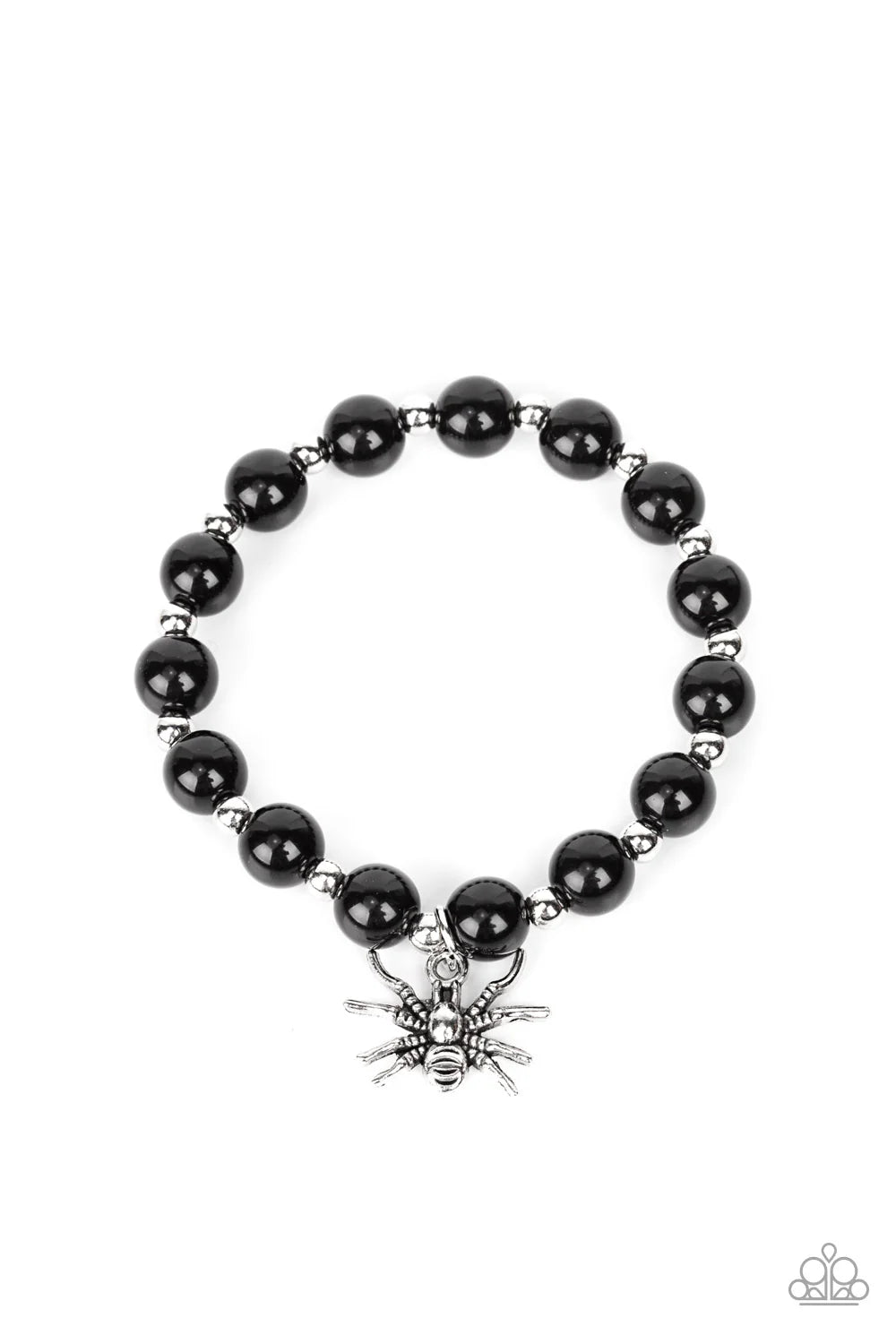 Five Starlet Shimmer bracelets in assorted colors and shapes. Accented with ghoulish charms - a witch's hat, a spider, a jack-o-lantern, a bat, and a skull - the stretchy beaded bracelets vary in patterns of white, black, orange, purple, and green.