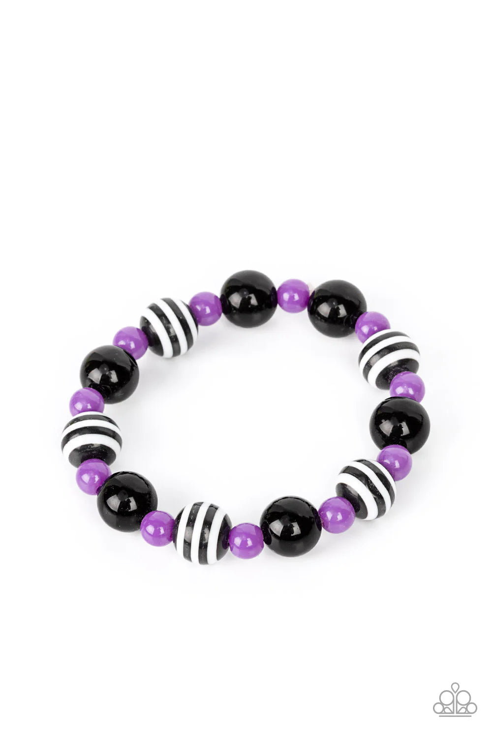 The five stretchy beaded bracelets vary in orange, purple, green, black and white patterns.
