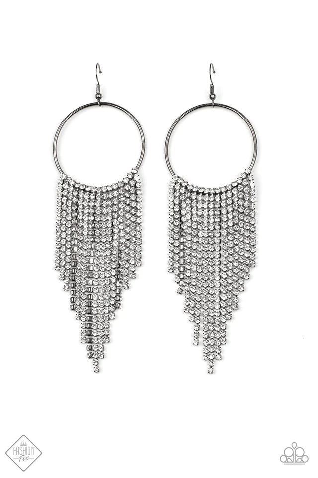 Tapered rows of glittery white rhinestones cascade from the bottom of a shiny gunmetal hoop, creating a glamorously glitzy fringe. Earring attaches to a standard fishhook fitting.