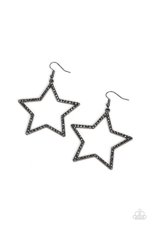 Smoky hematite rhinestones adorn the front of an oversized gunmetal star silhouette, sparking into a stellar centerpiece. Earring attaches to a standard fishhook fitting.